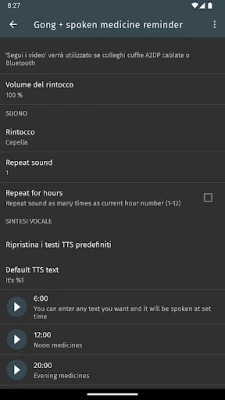 La gestione dei tuoi promemoria è incredibilmente flessibile. Potrai selezionare orari e intervalli specifici, con la possibilità di definire la precisione al quarto d'ora (00, 15, 30, 45 minuti). Ogni singolo campanello può avere un volume personalizzato, assicurandoti che sia sempre udibile senza essere fastidioso. Adatta i tuoi avvisi al tuo programma settimanale, scegliendo giorni specifici. L'applicazione è progettata per integrarsi nella tua vita quotidiana: i campanelli funzionano anche con auricolari, sia cablati che Bluetooth, e puoi decidere se attivarli solo a schermo acceso o anche durante una chiamata telefonica, per la massima discrezione o per non perdere mai un avviso.
