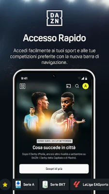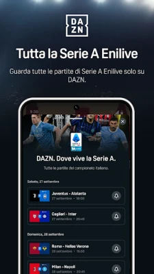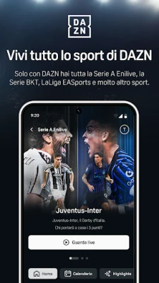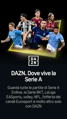 Con DAZN, il mondo dello sport si accende direttamente sul tuo schermo, trasformando ogni evento in un'esperienza vivida e coinvolgente. È la destinazione definitiva per gli appassionati che desiderano vivere le proprie passioni a 360 gradi, non importa dove si trovino. Immagina di avere accesso illimitato al meglio del calcio con la Serie A Enilive, la Serie BKT e LaLiga EA Sports, di sentire l'adrenalina della NFL, la potenza della boxe, la grazia del volley e l'emozione del ciclismo e del tennis, inclusi i prestigiosi appuntamenti di Eurosport con i Giochi Olimpici Invernali Milano Cortina 2026. Tutto questo, e molto altro, è DAZN: il tuo passaporto per un universo sportivo senza confini, disponibile in ogni istante.