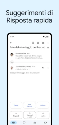 Mantenere la tua casella di posta organizzata non è mai stato così semplice. Etichetta, aggiungi a Speciali o elimina i messaggi e segnala lo spam con un tocco, oppure usa lo scorrimento rapido per archiviare o eliminare. Trova esattamente ciò che cerchi in un istante grazie a una ricerca fulminea che offre risultati istantanei, completamento automatico e suggerimenti ortografici. Le conversazioni in thread rendono la lettura fluida, mentre la composizione è agevolata dal completamento automatico dei contatti Google e del telefono. Non perdere mai un evento: rispondi agli inviti di Google Calendar direttamente all'interno di Gmail. E per chi è sempre in movimento, aggiungi una complicazione o un riquadro Gmail al tuo smartwatch Wear OS per avere le tue email sempre sotto controllo. Come parte integrante di Google Workspace, Gmail connette te e il tuo team, facilitando la collaborazione e l'efficienza complessiva.