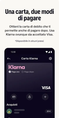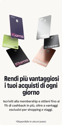 Ma Klarna va oltre la semplice gestione dei pagamenti. Trasforma ogni acquisto in un'opportunità di risparmio, con la possibilità di guadagnare fino al 10% di cashback su centinaia di negozi partner, un vantaggio che arricchisce il tuo saldo Klarna. Dimentica le infinite tessere fedeltà: l'app Klarna le raccoglie tutte in un unico luogo digitale, assicurandoti di non perdere mai un punto. E per una libertà ancora maggiore, la carta Klarna ti permette di pagare con la tua preferenza – subito o in un secondo momento – ovunque sia accettato Visa, senza costi nascosti o impatti sul tuo credito.