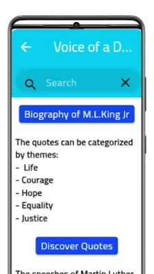 Martin Luther King: Voice of a Dream offre un portale unico e approfondito per esplorare la vita e l'incredibile impatto di uno dei più grandi visionari della storia. Questa applicazione è stata concepita per guidarti attraverso un viaggio illuminante nell'esistenza del Dr. Martin Luther King Jr., rivelando il suo percorso da giovane predicatore a figura centrale di un movimento globale. Scopri i momenti salienti della sua biografia, le sfide affrontate e le vittorie ottenute che hanno irrevocabilmente plasmato la lotta per i diritti civili e l'uguaglianza, offrendoti una comprensione completa del contesto storico e personale che ha generato il suo messaggio universale.