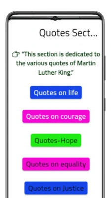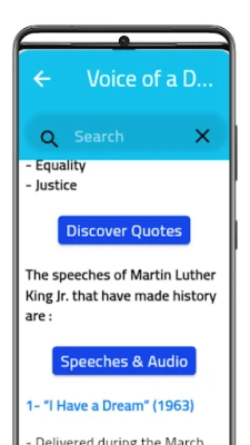 L'applicazione Martin Luther King: Voice of a Dream arricchisce ulteriormente l'esperienza con una selezione curata delle sue citazioni più iconiche e stimolanti. Queste perle di saggezza, scolpite dal tempo, continuano a risuonare con una potenza sorprendente, offrendo spunti di riflessione e incoraggiamento per la vita contemporanea. Attraverso queste parole immortali, l'eredità di Martin Luther King Jr. si manifesta in tutta la sua grandezza, invitandoti a fare tuoi i valori di giustizia, pace e perseveranza. Lasciati ispirare da un'eredità che trascende le generazioni e continua a illuminare il cammino verso un futuro più equo e consapevole.