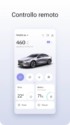 MAZDA 6e semplifica la gestione della tua auto. Controlla lo stato del veicolo in tempo reale, blocca le porte, gestisci il clima e monitora la ricarica da remoto. L'app offre un'esperienza di proprietà connessa e comoda, sempre a portata di mano.