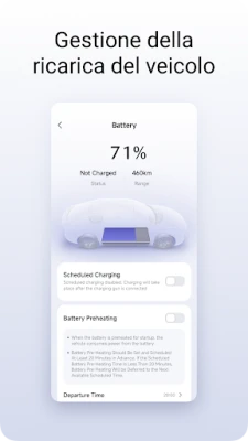 Con MAZDA 6e, il comfort e la sicurezza sono sempre garantiti, ovunque tu sia. Gestisci la tua auto con un semplice tocco: blocca o sblocca le portiere, apri o chiudi i finestrini e il bagagliaio, o attiva le luci d'emergenza e il clacson, tutto a distanza. Prepara l'abitacolo alla temperatura ideale prima ancora di salire a bordo, gestendo riscaldamento e ventilazione dei sedili e del volante con precisione. E per i veicoli elettrici, MAZDA 6e ti permette di monitorare lo stato di carica, l'autonomia residua e di programmare la ricarica, garantendoti sempre energia sufficiente per i tuoi viaggi.