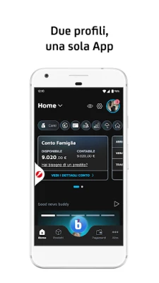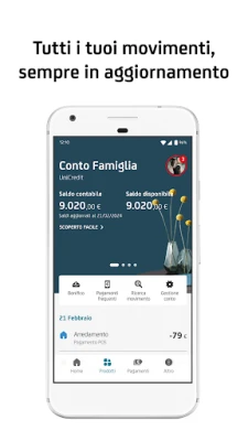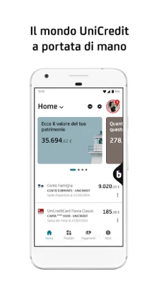 La nuova Home Page di Mobile Banking UniCredit è il tuo cruscotto personale, offrendoti una visione chiara e immediata di tutti i tuoi rapporti collegati: dai conti correnti alle carte, dai mutui agli investimenti. Non solo puoi impartire disposizioni con facilità, ma anche monitorare le tue spese in tempo reale, per una gestione consapevole e proattiva. Le sezioni dedicate ai "Conti correnti" e alle "Carte" ti offrono un controllo totale: consulta dettagliatamente movimenti e saldi, cerca transazioni specifiche, condividi l'IBAN e gestisci ogni aspetto delle tue carte di credito, debito e ricaricabili UniCredit. E con funzionalità come "Bilancio Familiare" e "Budget", organizzare le tue finanze e tenere traccia di ogni uscita diventa un gioco da ragazzi. Accedi all'area personale per personalizzare il profilo, ricevere notifiche e messaggi dalla Banca, consultare documenti, help e FAQ, o contattare UniCredit via telefono e chat.