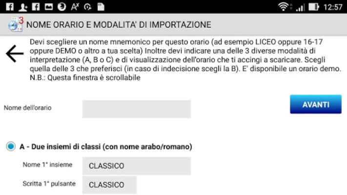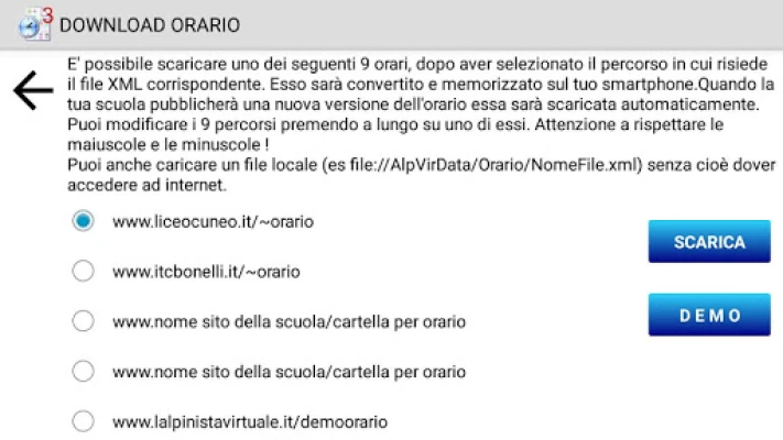Al primo avvio, l'applicazione richiede un semplice passaggio iniziale: l'acquisizione di un orario specifico. Che si tratti di uno dei tre formati compatibili o dell'orario dimostrativo, un singolo tocco attiva il processo. La conversione in un efficiente database SQLite si completa in meno di un minuto, ed è un'operazione da eseguire una sola volta. Una volta ottenuti i dati, la consultazione dell'orario non necessita più di una connessione internet, garantendo piena accessibilità ovunque e in qualsiasi momento. L'app offre la flessibilità di gestire fino a nove orari distinti, permettendo passaggi rapidi e intuitivi tra essi. Questa funzionalità è ideale per genitori con figli in scuole diverse o per docenti che desiderano esaminare gli orari di colleghi o di altri istituti.